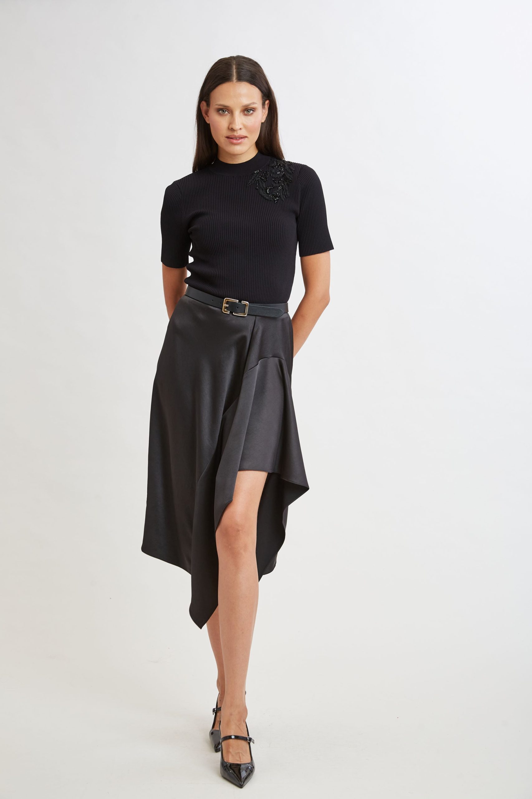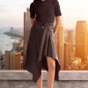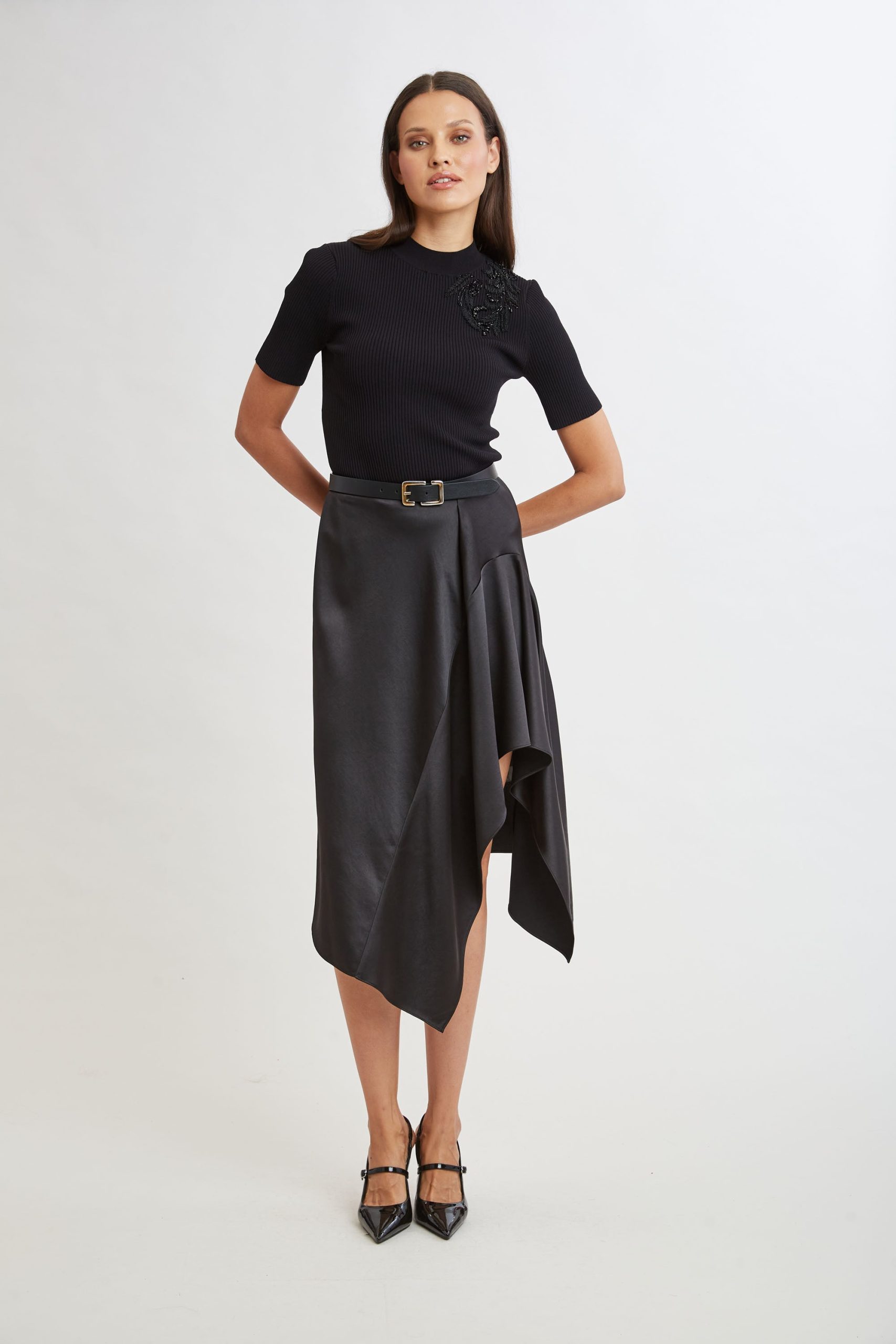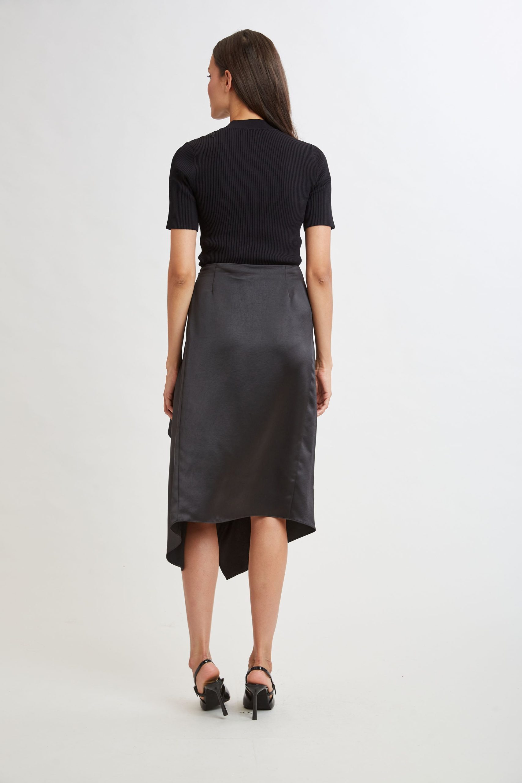 Indulge in the fluid elegance of our Asymmetric Hem Satin Midi Skirt. The skirt drapes beautifully and moves gracefully with every step, adding a dynamic touch to your look. We love it paired with cashmere for a dressed down vibe to dressing up.