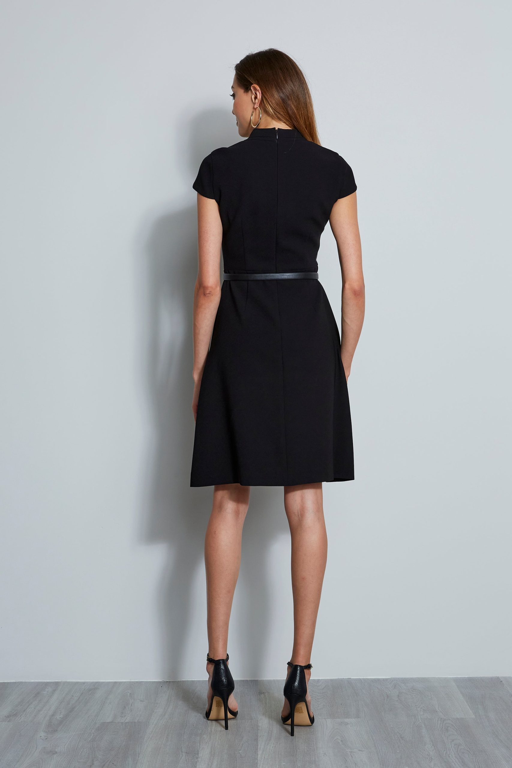 Elie’s take on the season’s must have fit & flare dress. Our Fluid Crepe delivers this body skimming silhouette with its open neckline, vegan leather belt & pleat detail at the shoulder. The dress is destined to become a favorite.