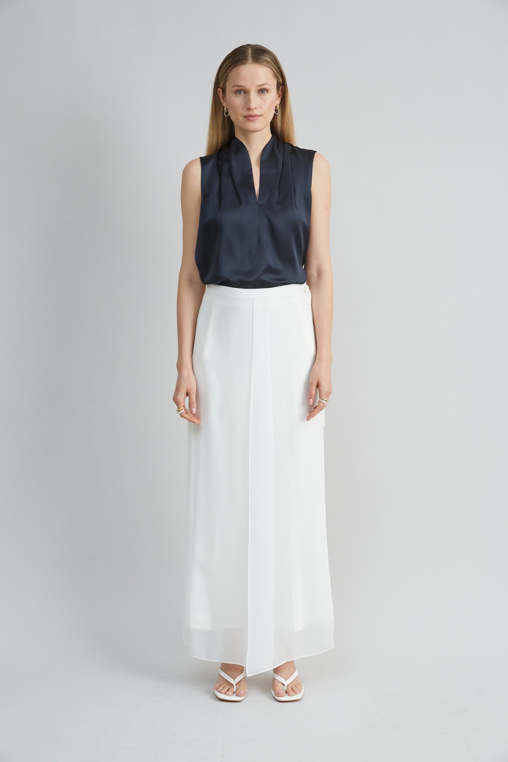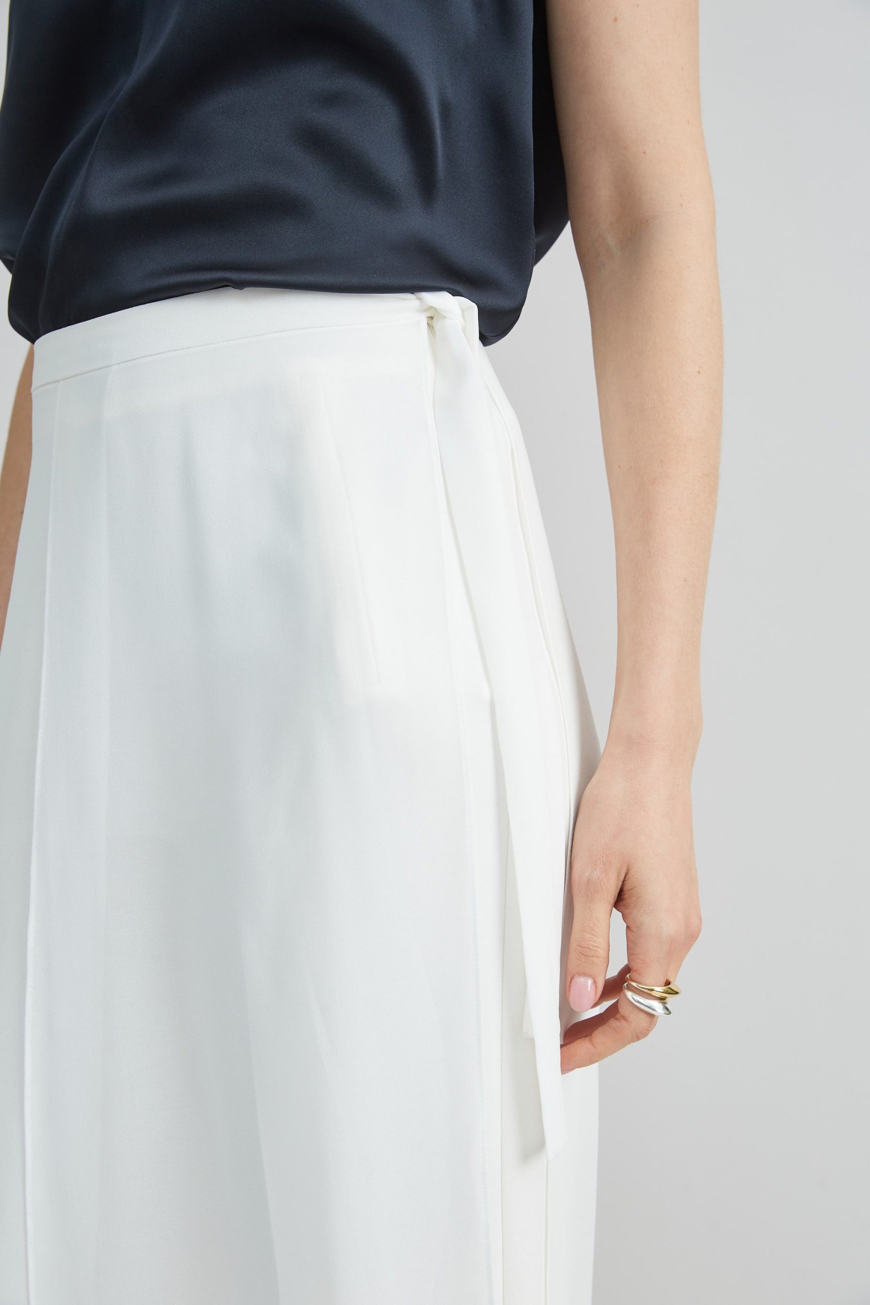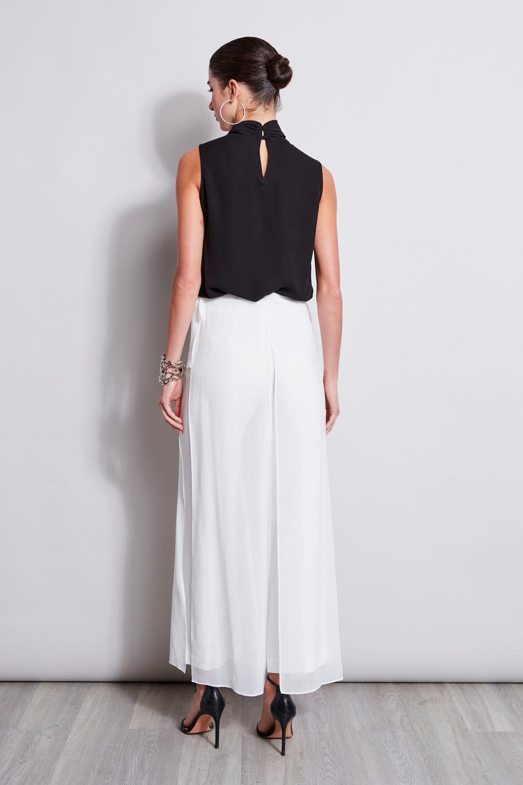 Our free-flowing pant is two looks in one. The Fluid Crepe pant has a removable Georgette apron overlay – perfect for dressing up or down. Consider this a seasonless addition to your closet.