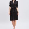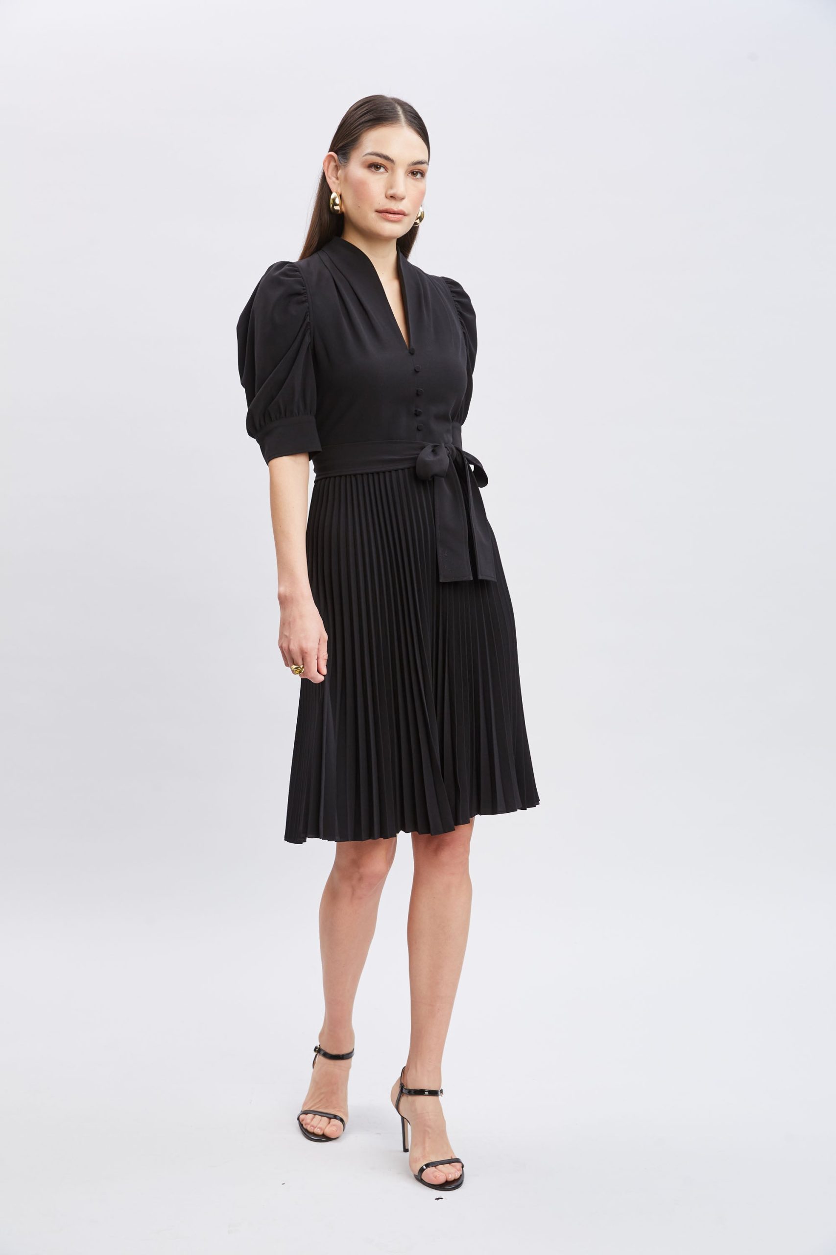Puff Sleeve Fit & Flare Dress with a Knife Pleated Laser Cut Skirt