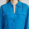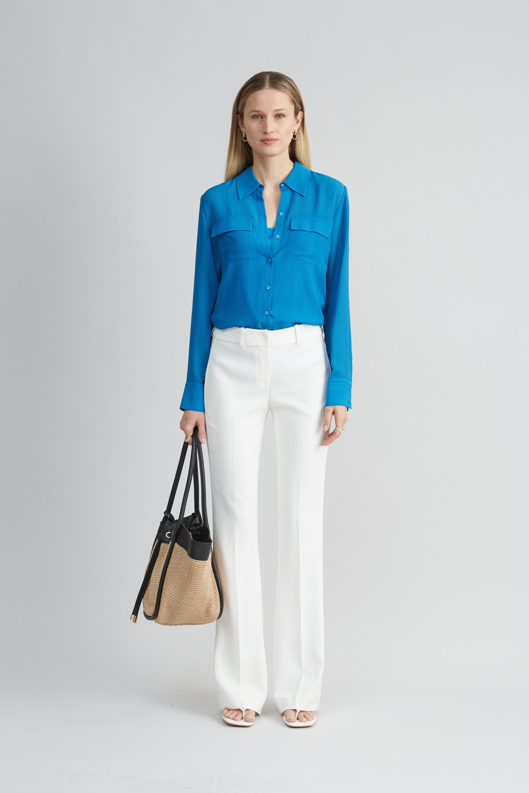 Crafted in textured Silk Georgette, the button down shirt is reimagined with utility pockets. he soft touch and patina of the silk bamboo fabric adds a feminine touch to this sporty chic shirt.