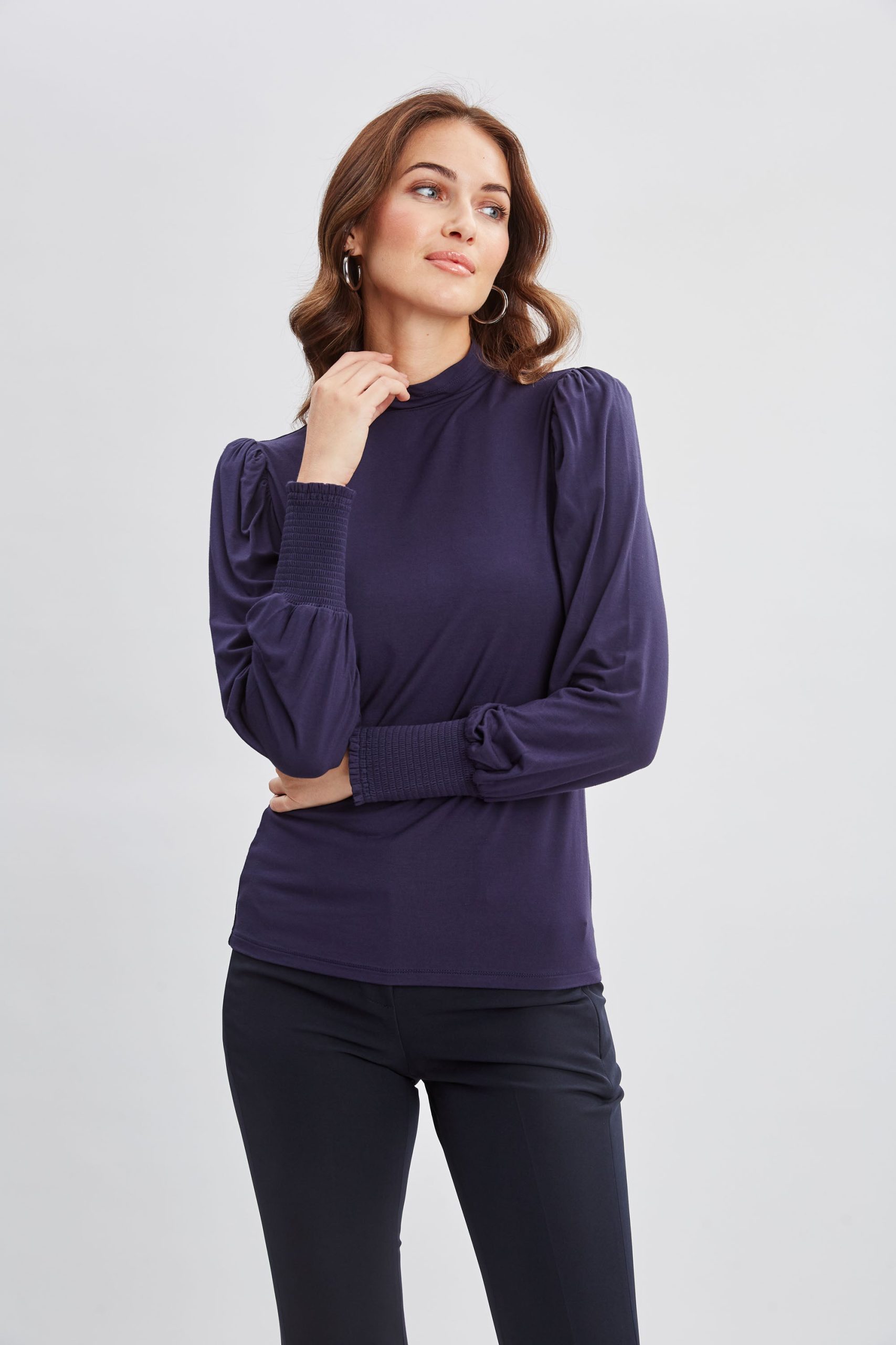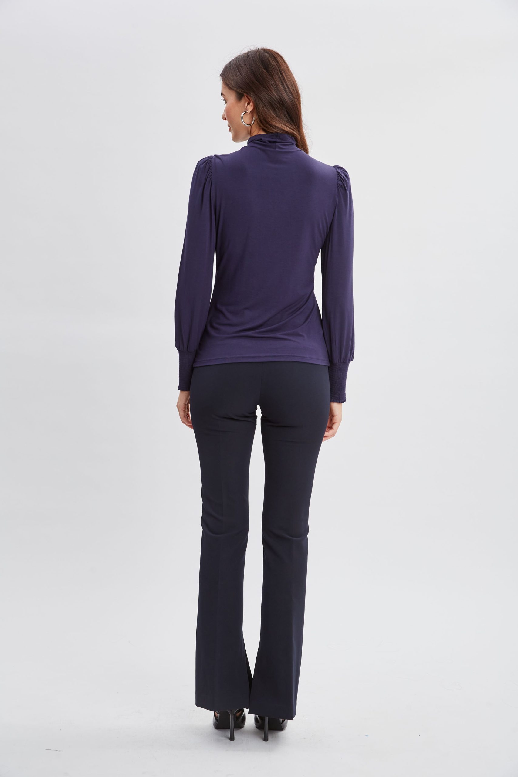 Refined and sophisticated, this Luxe Stretch Jersey Long Sleeve Turtle-Neck Knit features smocking at the cuff; lends a feminine twist to this essential Tee.